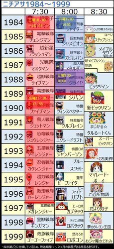 「ニチアサ」1984年から2017年までの歴史です。「とんがり帽子のメモル」が日曜8:30に来た1984年からを記載。メタルヒーローがニチアサに来たのが1989年4月「機動刑事ジバン」10話から。戦隊モノがニチアサに来たのが1997年4月の「電磁戦隊メガレンジャー」…