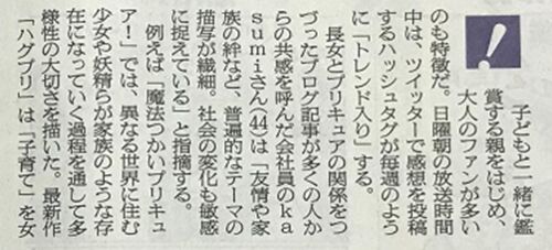 そんなに大したものもないのですけど。えーと。幼少の頃から、親に「頼むから、新聞に載る様な(悪い)事はするな」と言われて育ってきましたが、なんと「プリキュアの数字ブログ」管理人kasumi、新聞に載りました。プリキュア関連記事のインタビューで少し…